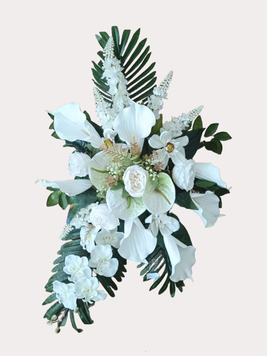 Ovaj aranžman od umjetnog cvijeća odlikuje se profinjenom bijelom paletom i skladnom kompozicijom koja unosi osjećaj mira i elegancije u svaki prostor. Kombinacija nježnih bijelih cvjetova i bogatog zelenila stvara prirodan i uravnotežen izgled.
