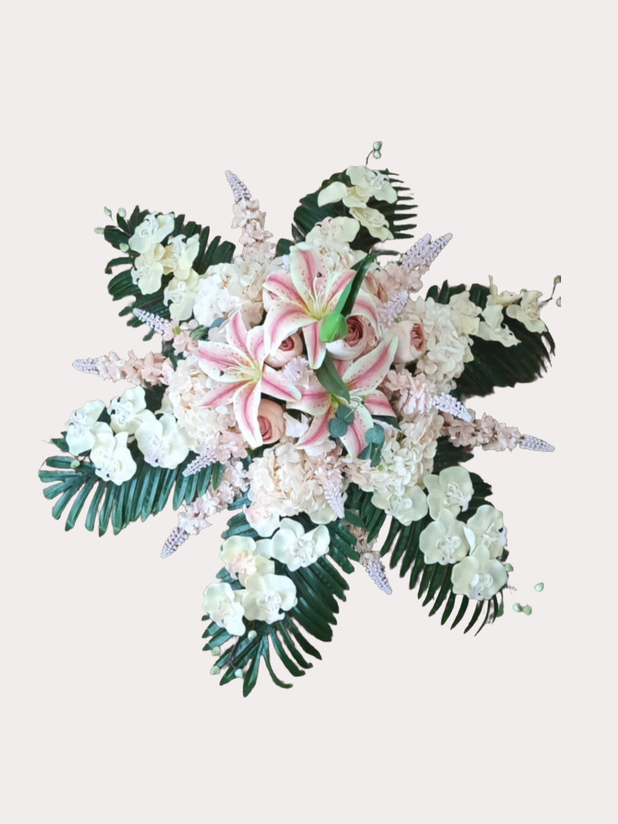 Ovaj dekorativni aranžman od umjetnog cvijeća odiše elegancijom i profinjenim stilom. U središtu kompozicije ističu se nježni ružičasto-bijeli ljiljani, okruženi bogatim cvjetovima i zelenilom koji stvaraju dojam raskoši i svježine.