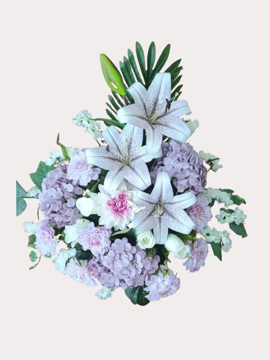 Ovaj aranžman od umjetnog cvijeća odiše nježnim lila i pastelnim tonovima koji unose toplinu i romantiku u svaki prostor. Dominantni cvjetovi ljiljana u kombinaciji s bogatim kuglastim cvatovima i sitnim cvjetnim detaljima stvaraju skladnu i profinjenu kompoziciju.